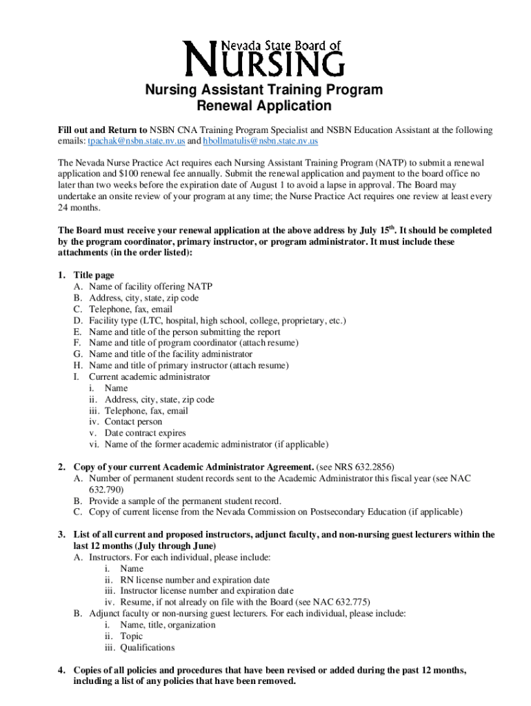 Nursing Assistant Training Program Renewal Application Fill out and Return to ISBN CNA Training Program Specialist and ISBN Education Assistant at the following emails: tpachak@nsbn.state.nv.us and
