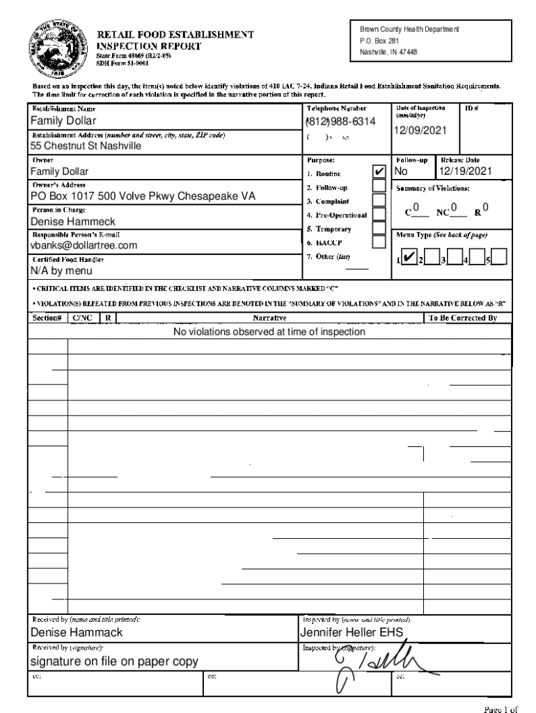 Brown County Health Department P.O. Box 281 Nashville, IN 47448RETAIL FOOD ESTABLISHMENT INSPECTION REPORT State Form 48669 (R2/205) SDH Form 510001Based on an inspection this day, the item’s noted