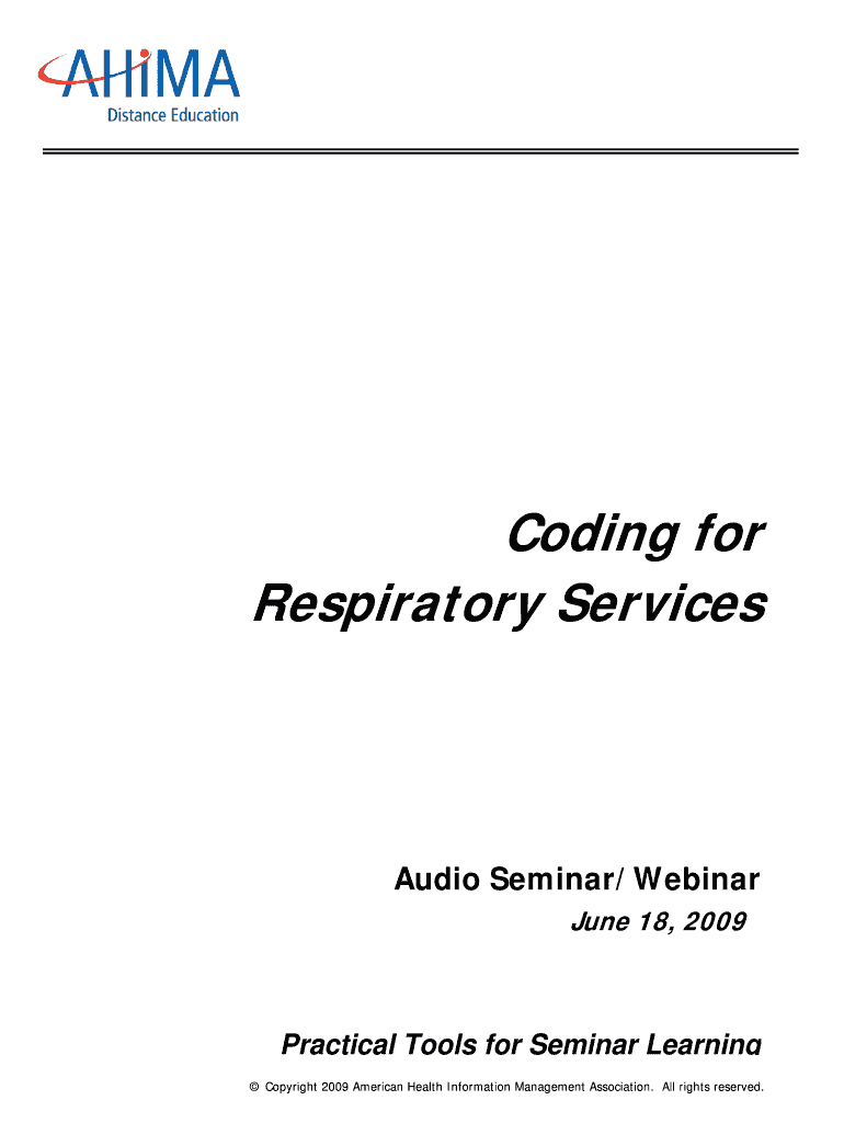 Coding for Respiratory ServicesAudio Seminar/Webinar June 18, 2009Practical Tools for Seminar Learning Copyright 2009 American Health Information Management Association. All rights reserved. Disclaimer