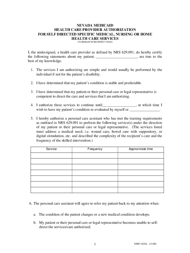 NEVADA MEDICAID HEALTH CARE PROVIDER AUTHORIZATION FOR SELF DIRECTED SPECIFIC MEDICAL, NURSING OR HOME HEALTH CARE SERVICES (TO REMAIN IN RECIPIENTS FILE)I, the undersigned, a health care provider