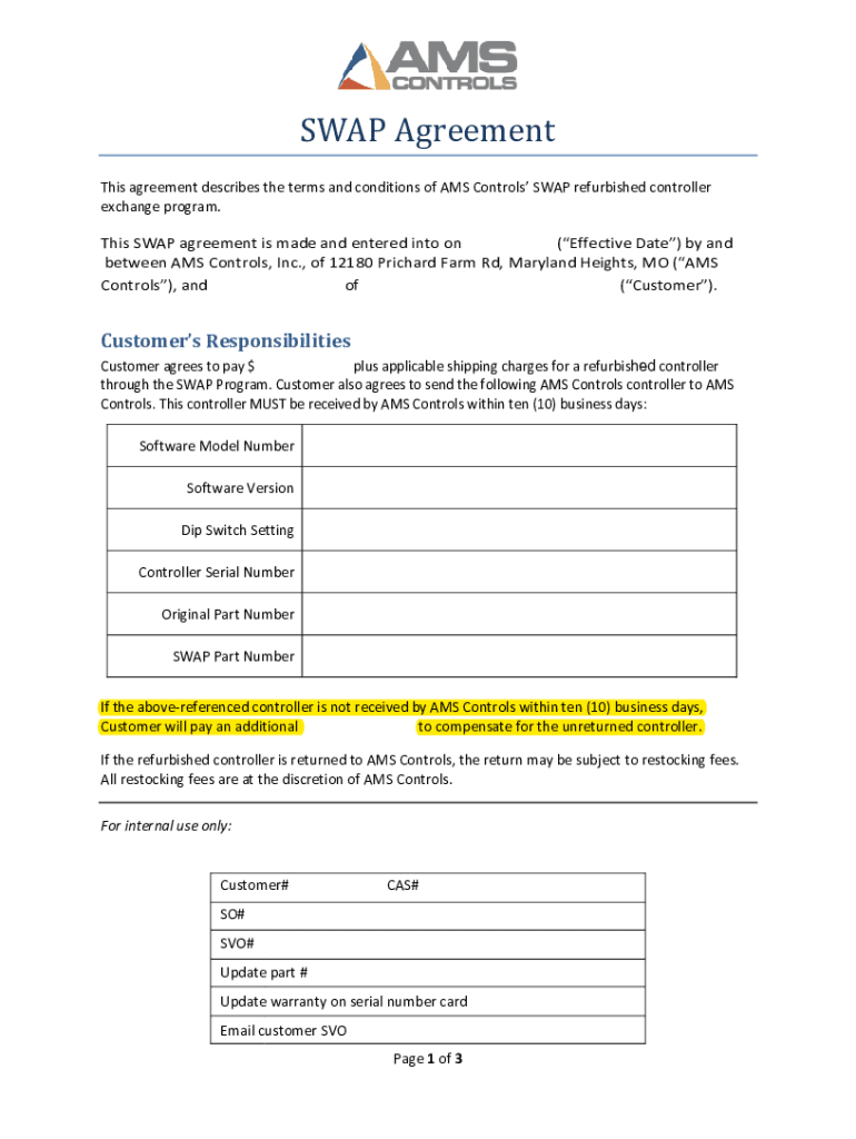 SWAP Agreement This agreement describes the terms and conditions of AMS Controls SWAP refurbished controller exchange program. This SWAP agreement is made and entered into on (Effective Date) by and