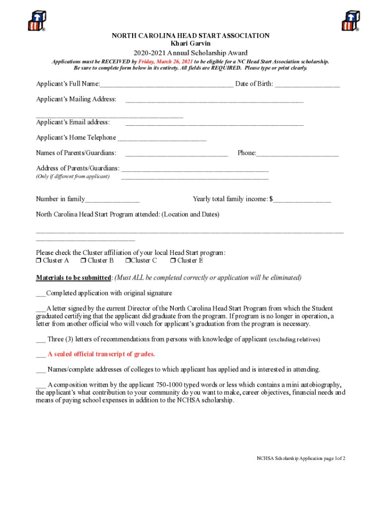 NORTH CAROLINA HEAD START ASSOCIATION Khaki Garvin20202021 Annual Scholarship Award Applications must be RECEIVED by Friday, March 26, 2021, to be eligible for a NC Head Start Association scholarship.