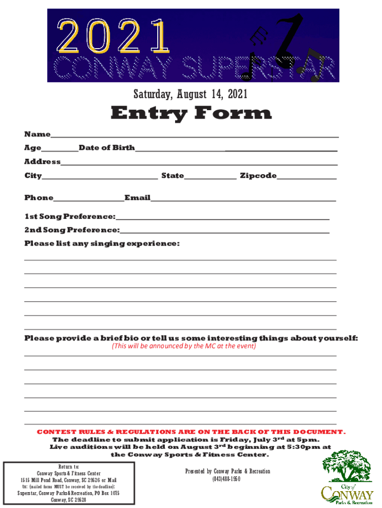 Saturday, August 14, 2021Entry Form Name Age Date of Birth___Address City PhoneStateZipcodeEmail1st Song Preference: 2nd Song Preference: Please list any singing experience:Please provide a brief