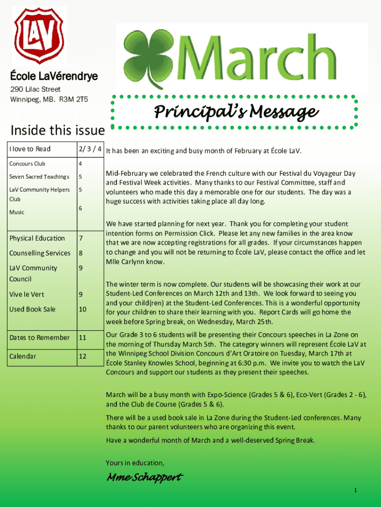Cole LaVrendrye 290 Lilac Street Winnipeg, MB. R3M 2T5Inside this issue I love to Read2/ 3 / 4 It has been an exciting and busy month of February at Cole Lav. Concourse Club4Seven Sacred Teachings5LaV