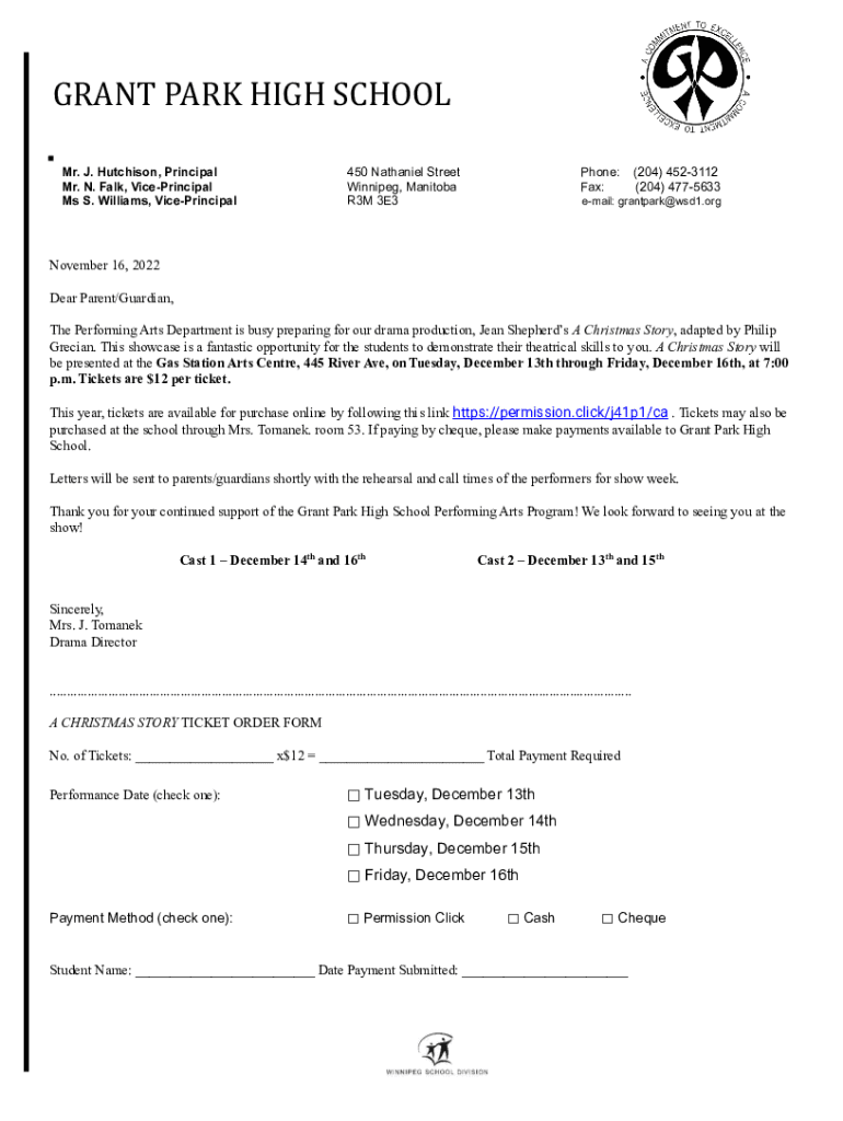 GRANT PARK HIGH SCHOOL Mr. J. Hutchison, Principal Mr. N. Fall, VicePrincipal Ms S. Williams, VicePrincipal450 Nathaniel Street Winnipeg, Manitoba R3M 3E3Phone: Fax:(204) 4523112 (204) 4775633email: