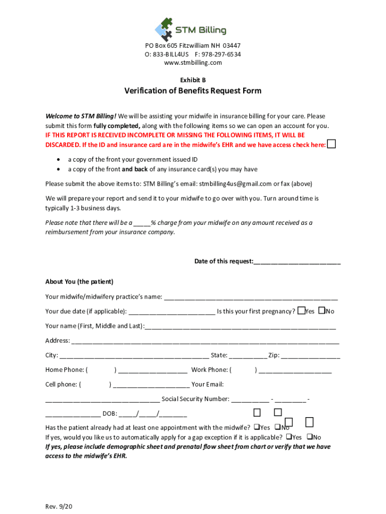 PO Box 605 Fitzwilliam NH 03447 O: 833BILL4US F: 9782976534 www.stmbilling.com Exhibit Verification of Benefits Request Form Welcome to STM Billing! We will be assisting your midwife in insurance