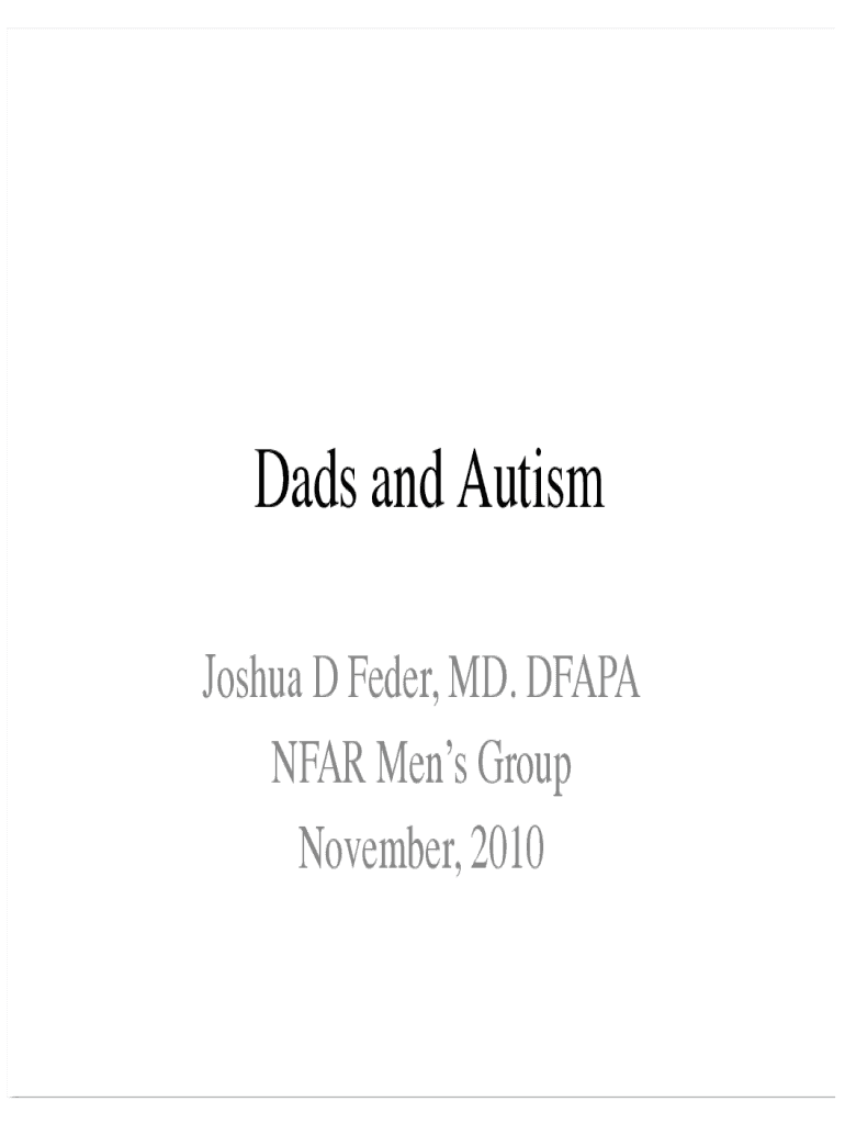 Dads and Autism Joshua D FEDER, MD. DFA PA NEAR Men Group November, 2010Joshua D FEDER MD DFAPAAssistant Clinical Professor, Dept of Psychiatry, University of California at San Diego School of Medicine