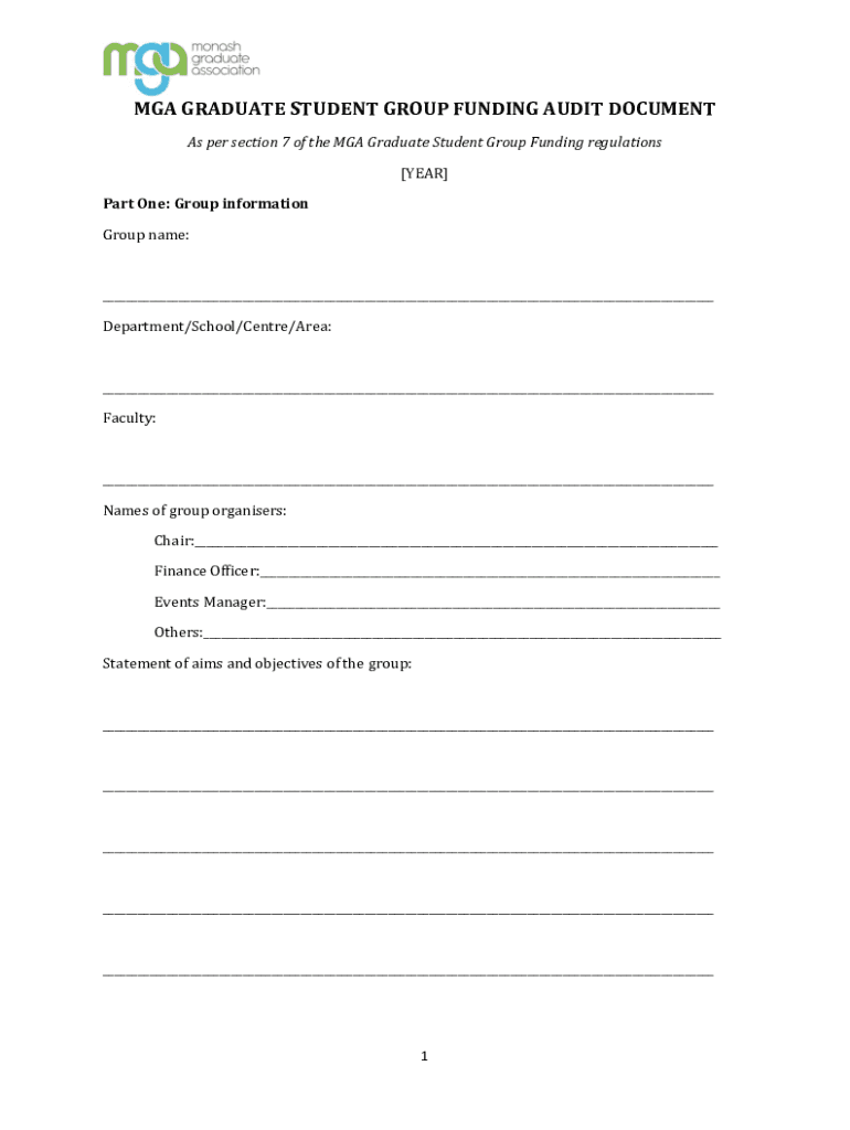 MGA GRADUATE STUDENT GROUP FUNDING AUDIT DOCUMENT As per section 7 of the MGA Graduate Student Group Funding regulations [YEAR] Part One: Group information Group name:___ Department/School/Center/Area:___