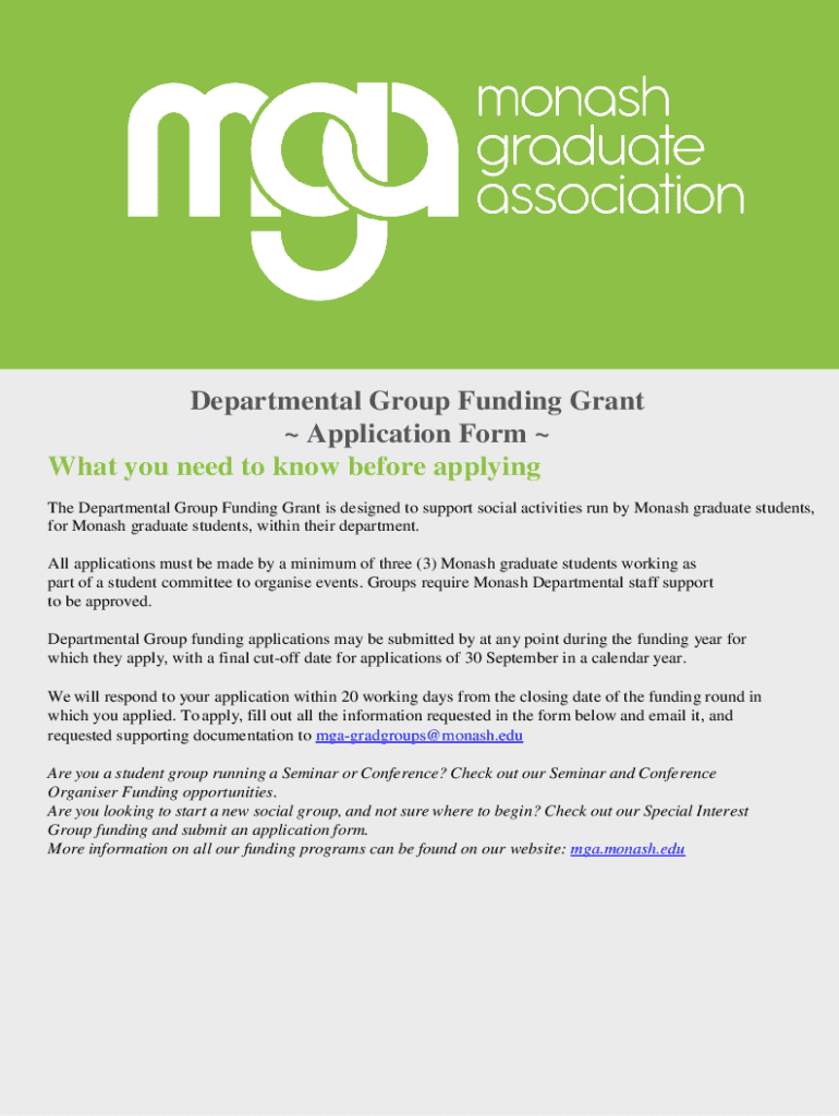 Departmental Group Funding Grant Application Form What you need to know before applying The Departmental Group Funding Grant is designed to support social activities run by Monash graduate students,