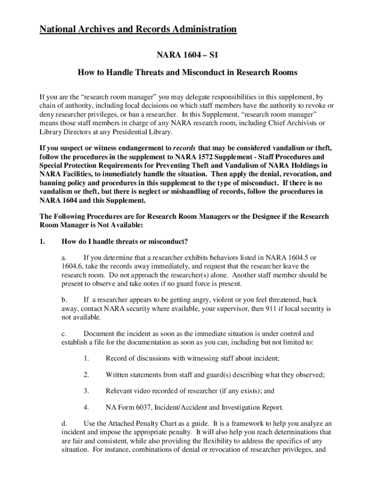 National Archives and Records Administration NARA 1604 S1 How to Handle Threats and Misconduct in Research Rooms If you are the research room manager you may delegate responsibilities in this supplement,