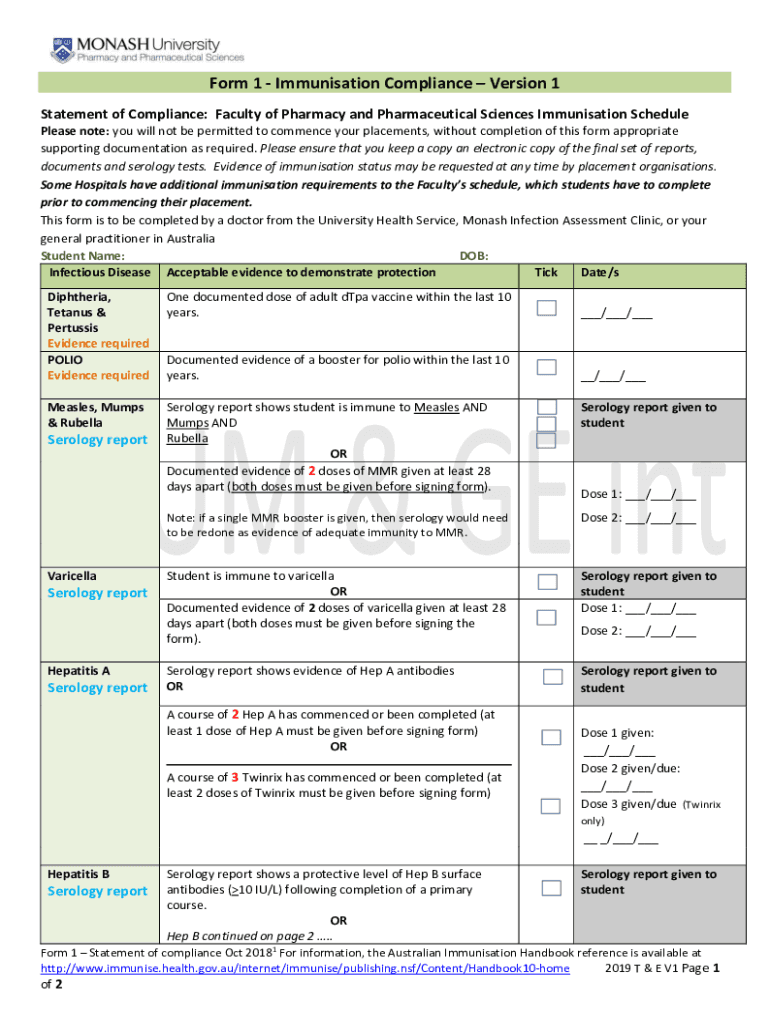 Form 1 Immunization Compliance Version 1 Statement of Compliance: Faculty of Pharmacy and Pharmaceutical Sciences Immunization Schedule Please note: you will not be permitted to commence your placements,