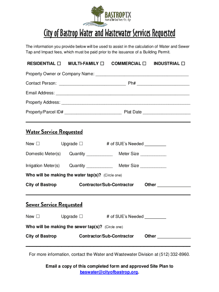 City of Bastrop Water and Wastewater Services Requested The information you provide below will be used to assist in the calculation of Water and Sewer Tap and Impact fees, which must be paid prior