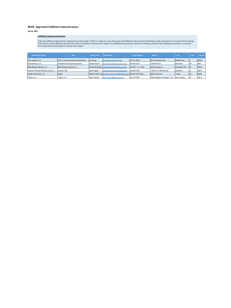 REM Approved Fulfillment Subcontractors April 8, 2020, Fulfillment Subcontractor Program Under the Fulfillment Subcontractor Program the Purchase Order (Order) is made out to one of the approved Fulfillment