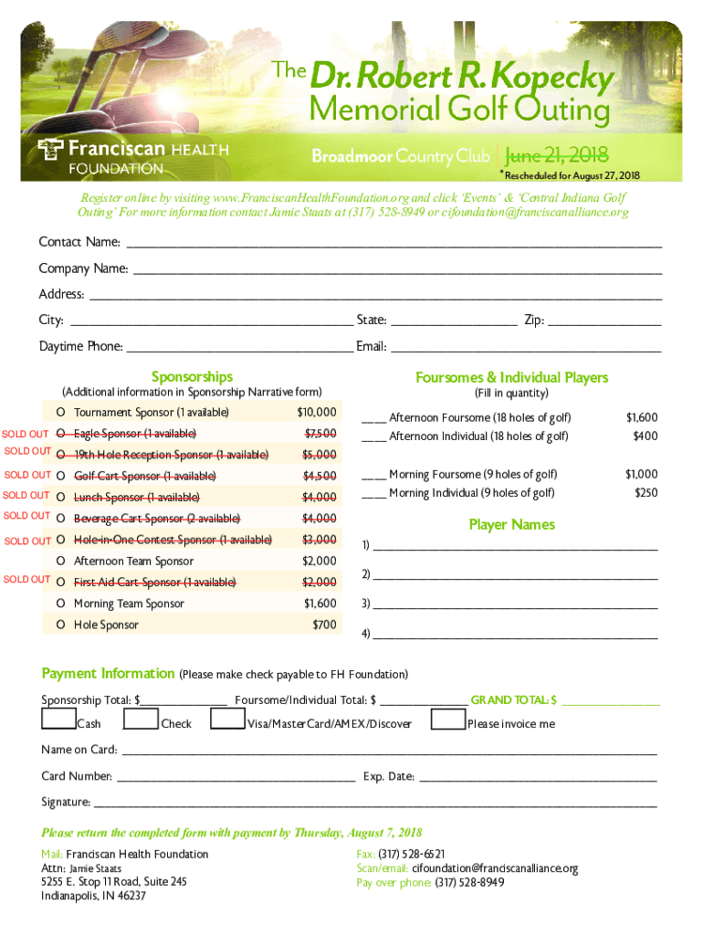 *Rescheduled for August 27, 2018Register online by visiting www.FranciscanHealthFoundation.org and click Events & Central Indiana Golf Outing For more information contact Jamie Starts at (317) 5288949