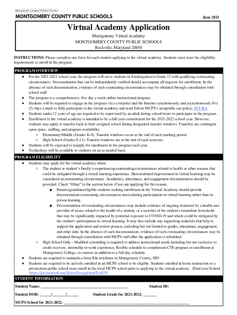 June 2021Virtual Academy Application Montgomery Virtual Academy MONTGOMERY COUNTY PUBLIC SCHOOLS Rockville, Maryland 20850 INSTRUCTIONS: Please complete one form for each student applying to the virtual