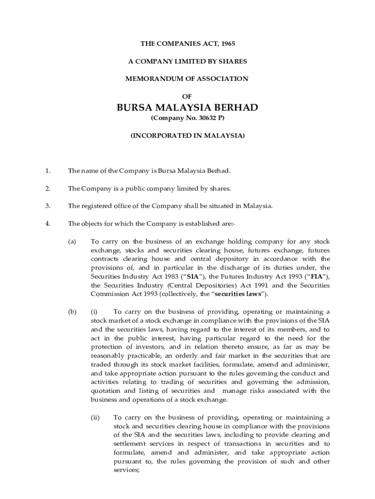THE COMPANIES ACT, 1965 A COMPANY LIMITED BY SHARES MEMORANDUM OF ASSOCIATION BURSA MALAYSIA BROAD (Company No. 30632 P)(INCORPORATED IN MALAYSIA)1. The name of the Company is Bursa Malaysia Broad.2.