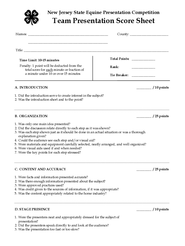 New Jersey State Equine Presentation CompetitionTeam Presentation Scoresheet Names: ___County: ______ Title: ___ Time Limit: 1015 minutesTotal Points: ___Penalty: 1 point will be deducted from the