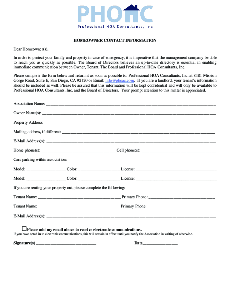 HOMEOWNER CONTACT INFORMATION Dear Homeowner(s), In order to protect your family and property in case of emergency, it is imperative that the management company be able to reach you as quickly as