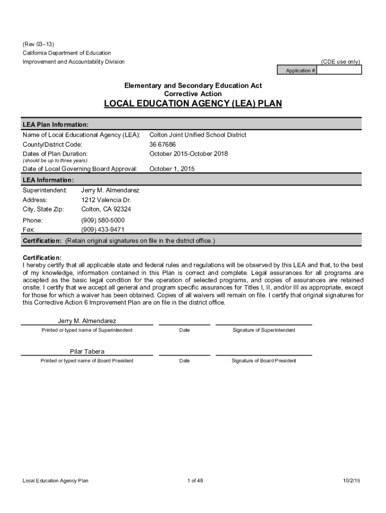(Rev 0313) California Department of Education Improvement and Accountability Division(CDE use only) Application #Elementary and Secondary Education Act Corrective ActionLOCAL EDUCATION AGENCY (LEA)