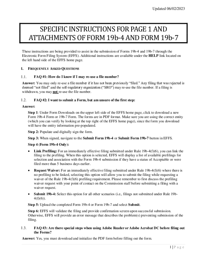 Updated 06/02/2023SPECIFIC INSTRUCTIONS FOR PAGE 1 AND ATTACHMENTS OF FORM 19b4 AND FORM 19b7 These instructions are being provided to assist in the submission of Forms 19b4 and 19b7 through the Electronic
