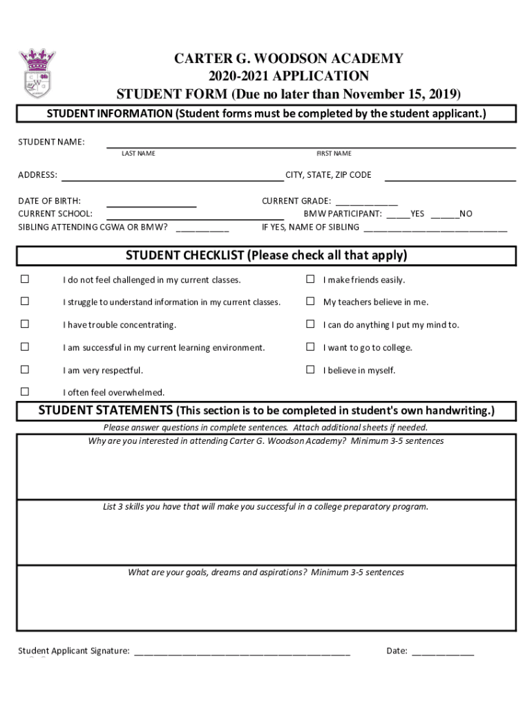 CARTER G. WOODSON ACADEMY 20202021 APPLICATION STUDENT FORM (Due no later than November 15, 2019) STUDENT INFORMATION (Student forms must be completed by the student applicant.) STUDENT NAME: LAST