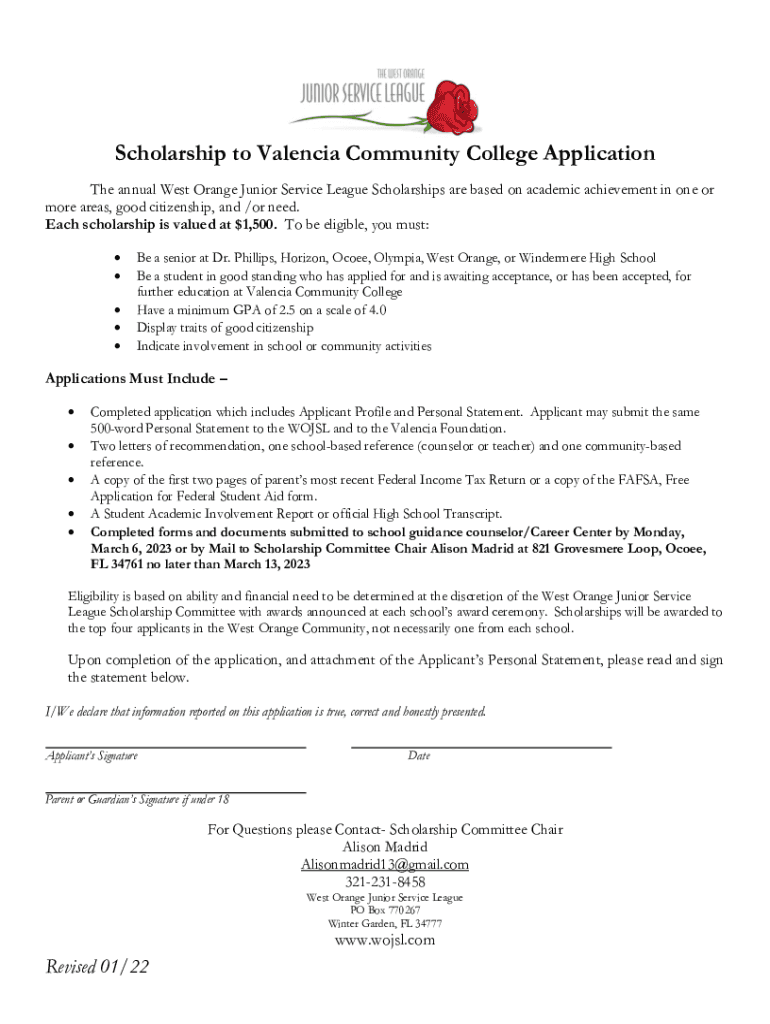 Scholarship to Valencia Community College Application The annual West Orange Junior Service League Scholarships are based on academic achievement in one or more areas, good citizenship, and /or need.