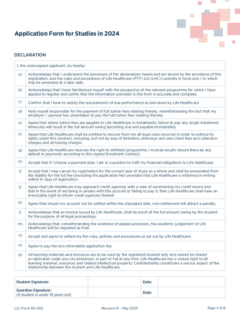 Nursing College Application Form for Studies in 2024 Life Healthcare Group (Pty) Ltd is registered as a Private Higher Education College with the DIET. Registration Number 2008/HE07/00LCLFormRS002Revision