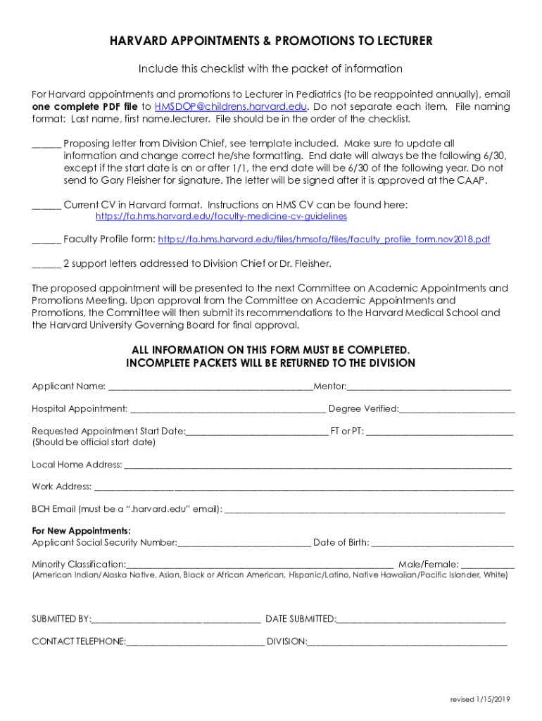 HARVARD APPOINTMENTS & PROMOTIONS TO LECTURER Include this checklist with the packet of information For Harvard appointments and promotions to Lecturer in Pediatrics (to be reappointed annually),