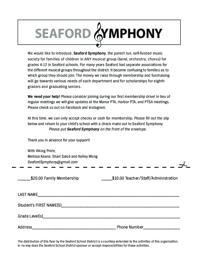 SEAFOOD SYMPHONY We would like to introduce, Seafood Symphony, the parent run, self funded music society for families of children in ANY musical group (band, orchestra, chorus) for grades 412 in Seafood
