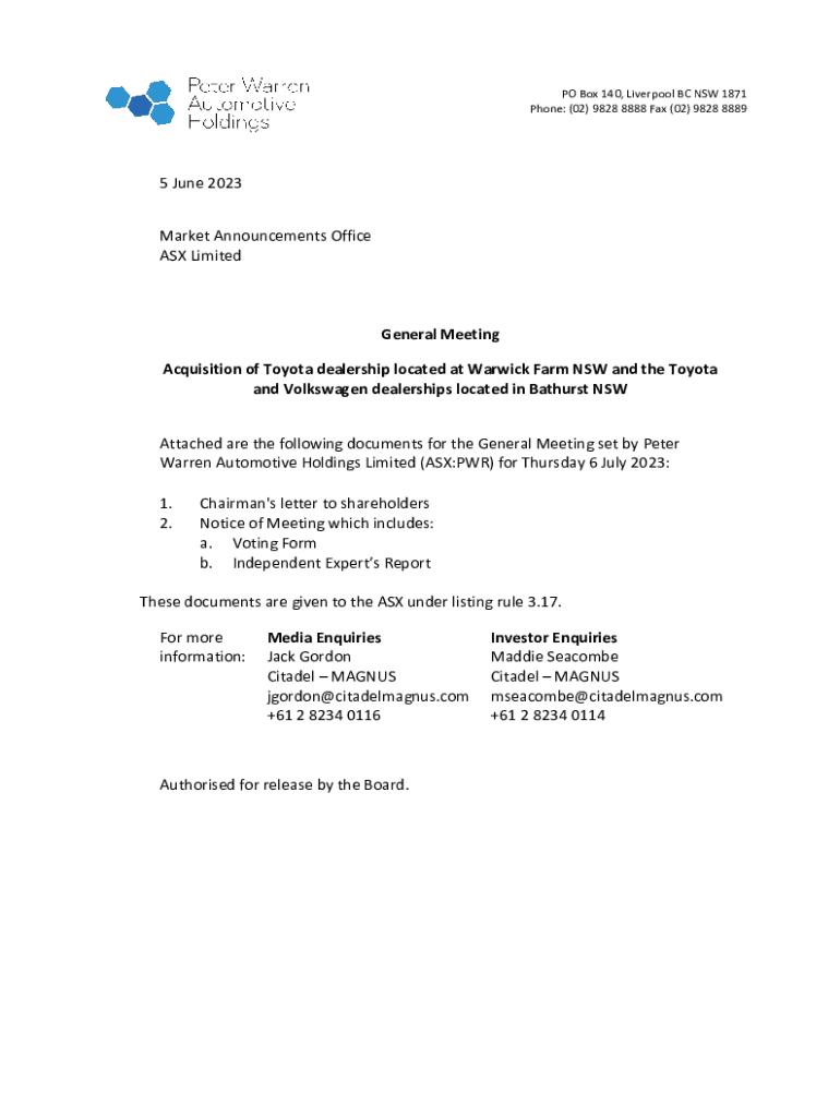 PO Box 140, Liverpool BC NSW 1871 Phone: (02) 9828 8888 Fax (02) 9828 88895 June 2023 Market Announcements Office ASX LimitedGeneral Meeting Acquisition of Toyota dealership located at Warwick Farm
