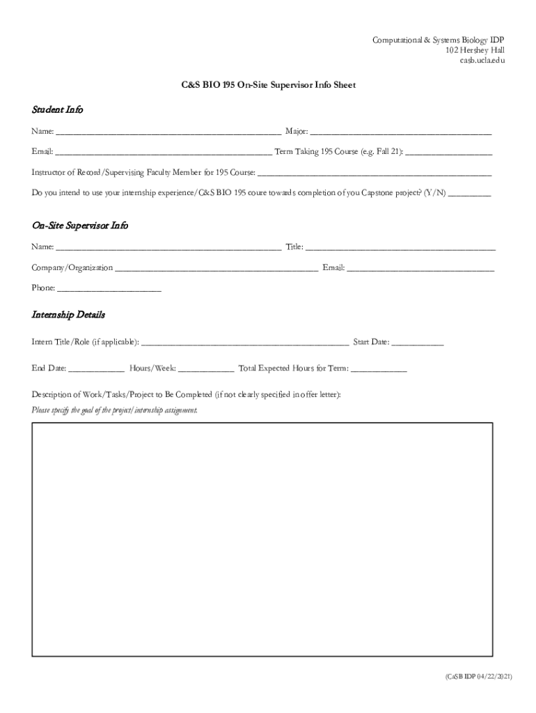 Computational & Systems Biology IDP 102 Hershey Hall case.UCLA.educes BIO 195 Onsite Supervisor Info SheetStudent Info Name: ___ Major: ___ Email: ___ Term Taking 195 Course (e.g. Fall 21): ___ Instructor