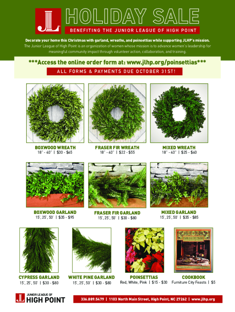 BENEFITING THE JUNIOR LEAGUE OF HIGH POINT Decorate your home this Christmas with garland, wreaths, and poinsettias while supporting Clips mission. The Junior League of High Point is an organization