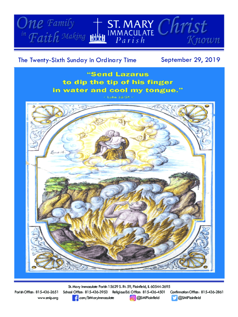 The Twentieth Sunday in Ordinary Time September 29, 2019Use Green Guide marks to place cover photo over this text box. Size of Cover Photo should be 7.33 H × 7.5 W. Parish Office: 8154362651 www.smip.orgSt.
