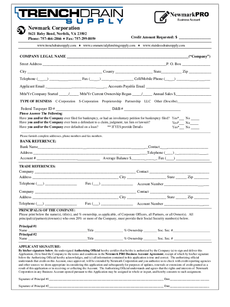 Newark Corporation5621 Baby Road, Norfolk, VA 23502 Phone: 7574662866 Fax: 7572998059Credit Amount Requested: $ ___www.trenchdrainsupply.com www.commercialplumbingsupply.com www.stainlessdrainsupply.comCOMPANY