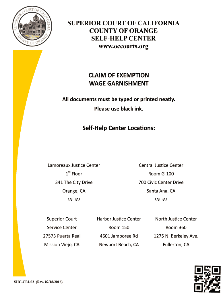 SUPERIOR COURT OF CALIFORNIA COUNTY OF ORANGE SELFLESS CENTER www.occourts.org CLAIMOFEXEMPTION WAGEGARNISHMENT Alldocumentsmustbetypedorprintedneatly. Pleaseuseblackink. SelfHelpCenterLoca ONS: Lamoreaux