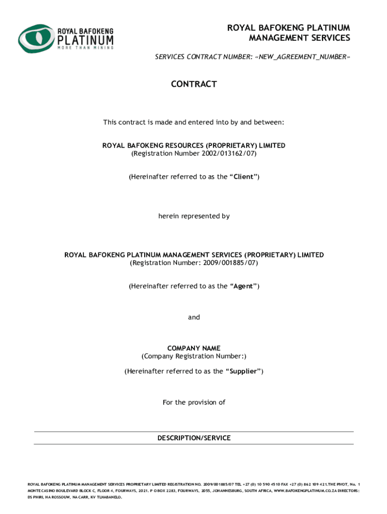 ROYAL BROKEN PLATINUM MANAGEMENT SERVICES CONTRACT NUMBER: NEW_AGREEMENT_NUMBERCONTRACTThis contract is made and entered into by and between: ROYAL BROKEN RESOURCES (PROPRIETARY) LIMITED (Registration