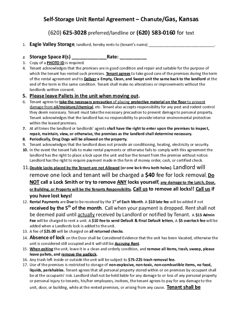 SelfStorage Unit Rental Agreement Canute/Gas, Kansas (620) 6253028 preferred/landline or (620) 5830160 for text 1. Eagle Valley Storage, landlord, hereby rents to (tenants name) ___.2. Storage Space