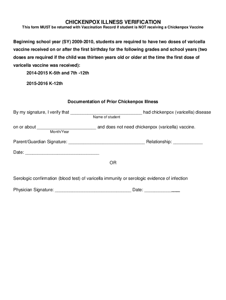 CHICKENPOX ILLNESS VERIFICATION This form MUST be returned with Vaccination Record if student is NOT receiving a Chickenpox VaccineBeginning school year (SY) 20092010, students are required to have