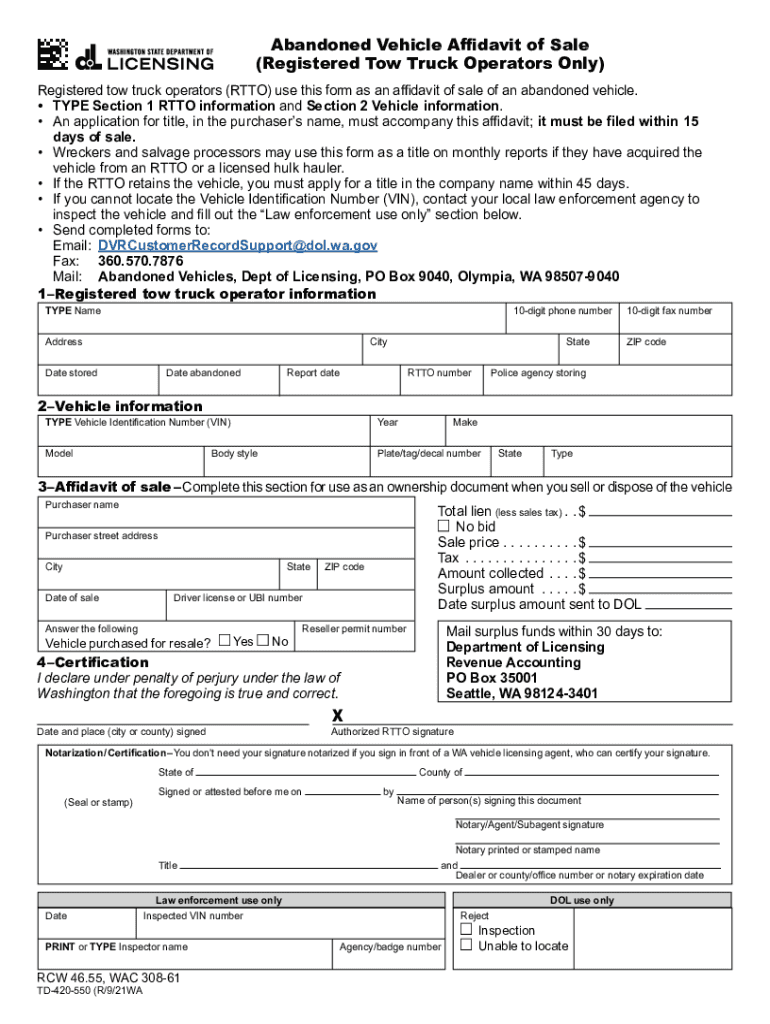 Click here to START or CLEAR, then hit the TAB buttonAbandoned Vehicle Affidavit of Sale (Registered Tow Truck Operators Only) Registered tow truck operators (OTTO) use this form as an affidavit of