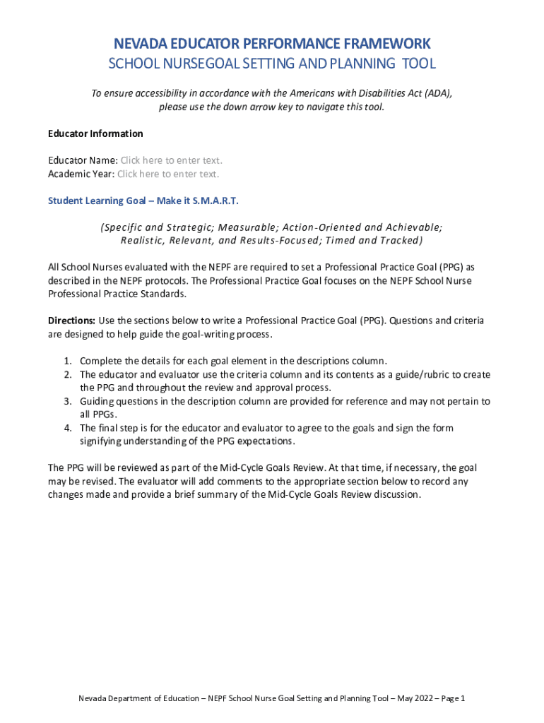 NEVADA EDUCATOR PERFORMANCE FRAMEWORK SCHOOL NURSE GOAL SETTING AND PLANNING TOOL To ensure accessibility in accordance with the Americans with Disabilities Act (ADA), please use the down arrow key