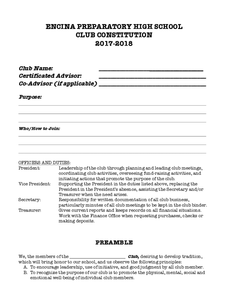 ENC INA PREPARATORY HIGH SCHOOL CLUB CONSTITUTION 20172018 Club Name: ___ Certificated Advisor: ___ Advisor (if applicable) ___ Purpose:Who/How to Join:OFFICERS AND DUTIES: President: Leadership of