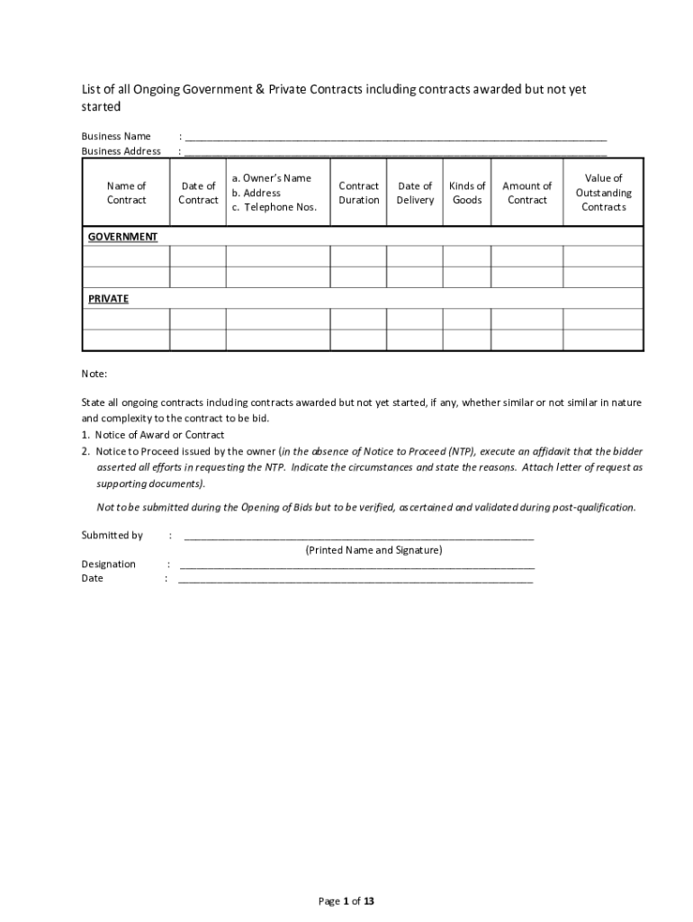 List of all Ongoing Government & Private Contracts including contracts awarded but not yet started Business Name Business Address: ___ : ___Name of Contractual of Contract. Owners Name b. Address