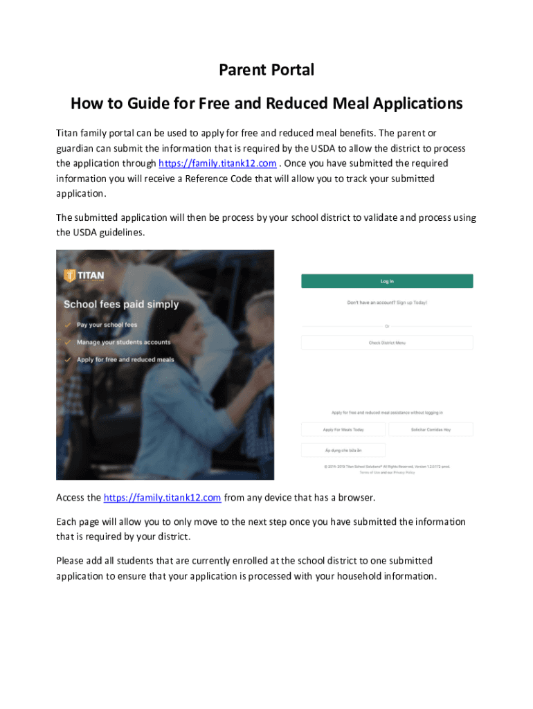 Parent Portal How to Guide for Free and Reduced Meal Applications Titan family portal can be used to apply for free and reduced meal benefits. The parent or guardian can submit the information that