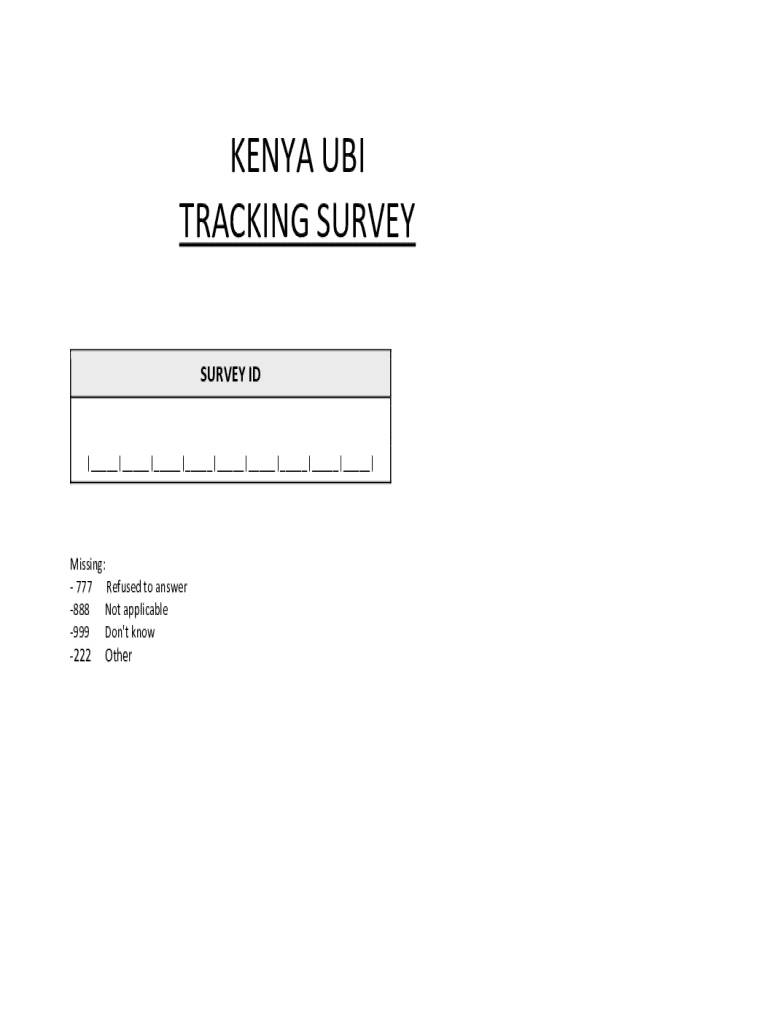 KENYA FBI TRACKING SURVEY ID|___|___|___|___|___|___|___|___|___|Missing: 777 Refused to answer 888 Not applicable 999 Don\'t know222OtherPreInterview Information and Consent 1.HH ID2. County Name3.