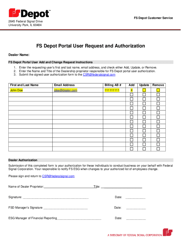 FS Depot Customer Service 2645 Federal Signal Drive University Park, IL 60484FS Depot Portal User Request and Authorization Dealer Name: FS Depot Portal User Add and Change Request Instructions 1.