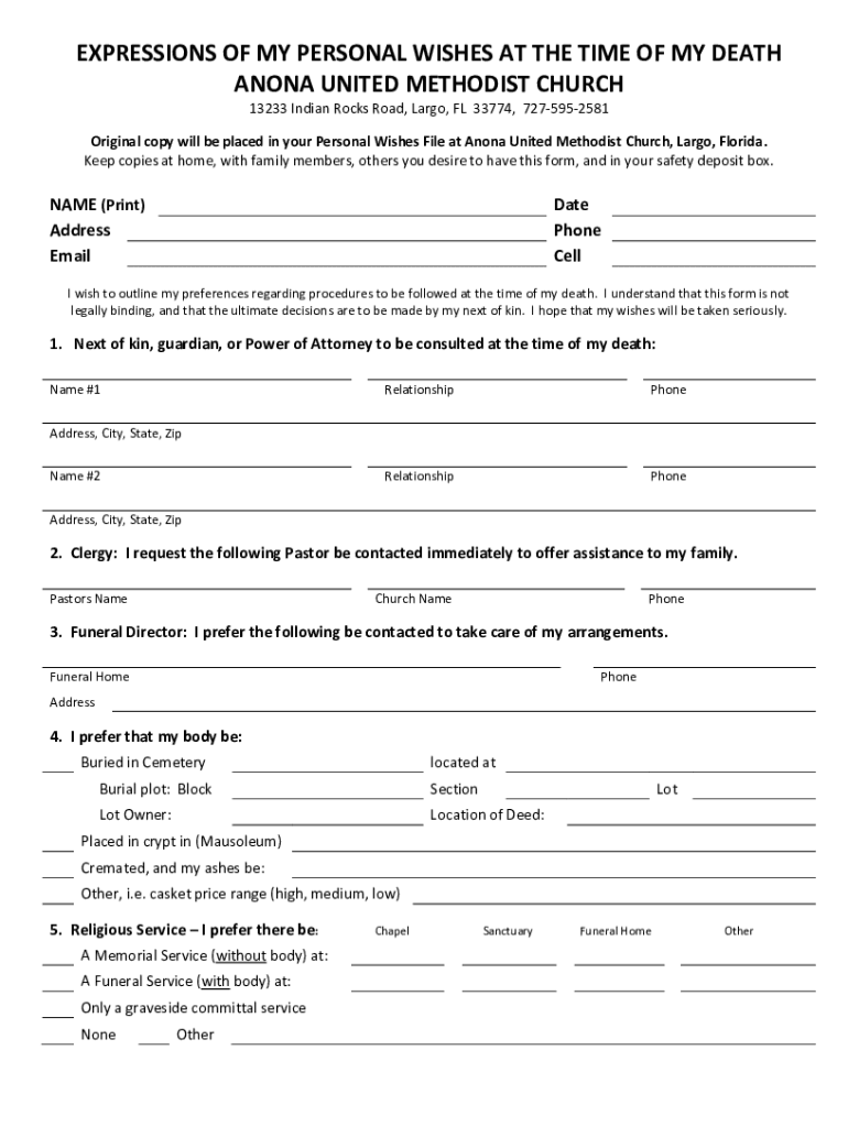 EXPRESSIONS OF MY PERSONAL WISHES AT THE TIME OF MY DEATH ANNA UNITED METHODIST CHURCH 13233 Indian Rocks Road, Largo, FL 33774, 7275952581 Original copy will be placed in your Personal Wishes File