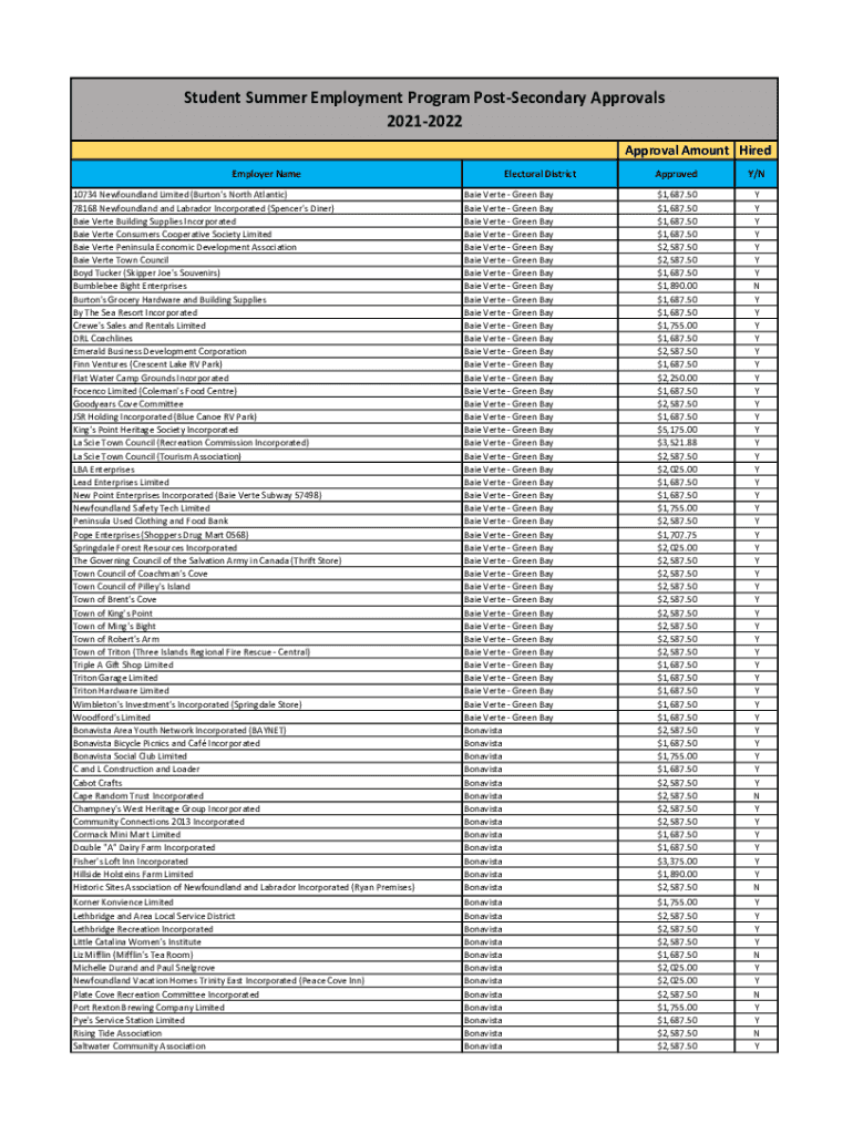 Student Summer Employment Program PostSecondary Approvals 20212022 Approval Amount Hired Approved/N10734 Newfoundland Limited (Burton\'s North Atlantic) 78168 Newfoundland and Labrador Incorporated