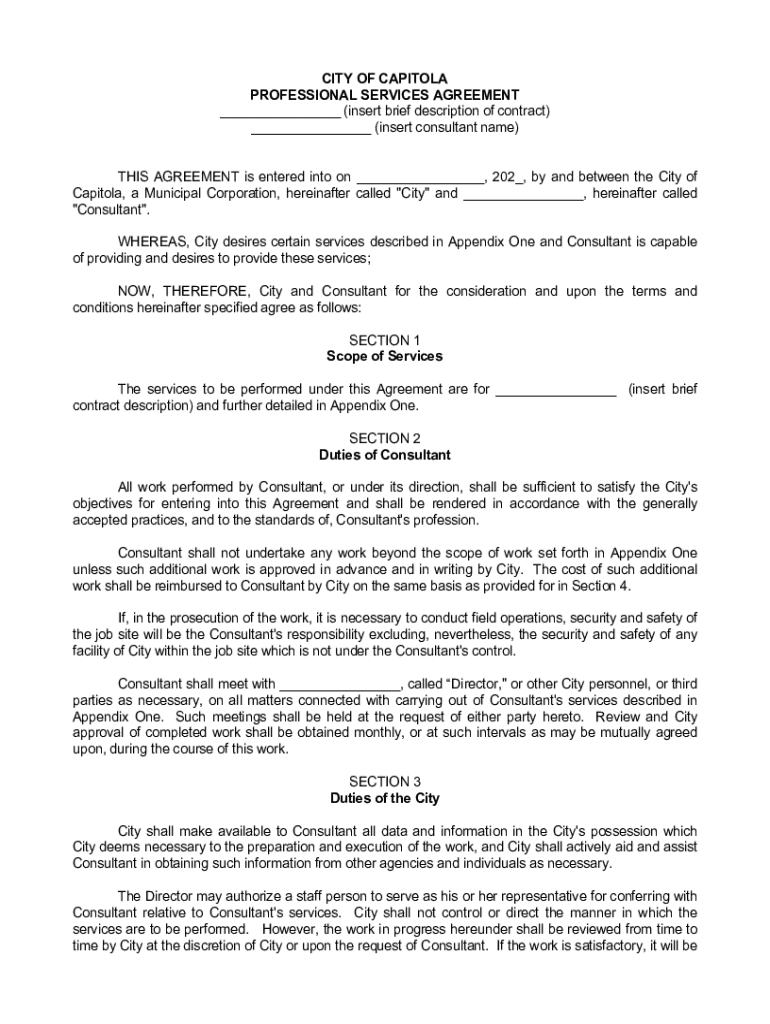CITY OF CAPITOL PROFESSIONAL SERVICES AGREEMENT ___ (insert brief description of contract) ___ (insert consultant name) THIS AGREEMENT is entered into on ___, 202_, by and between the City of Capitol,
