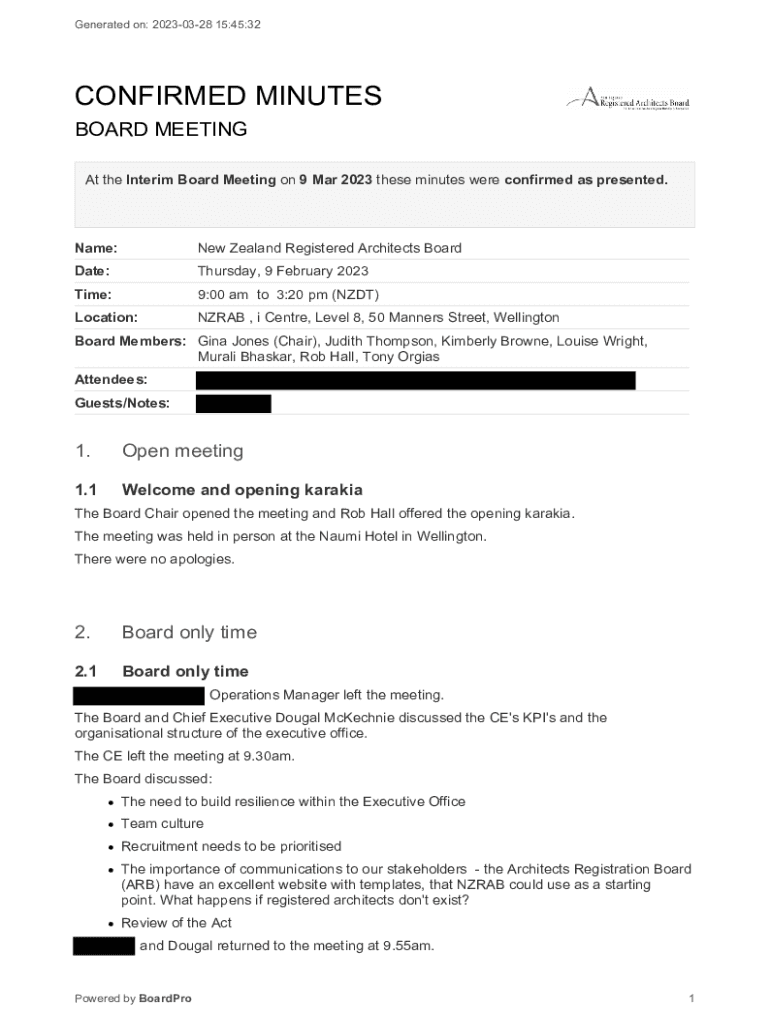 Generated on: 20230328 15:45:32CONFIRMED MINUTES BOARD MEETING At the Interim Board Meeting on 9 Mar 2023 these minutes were confirmed as presented. Name:New Zealand Registered Architects Boardwalk:Thursday,