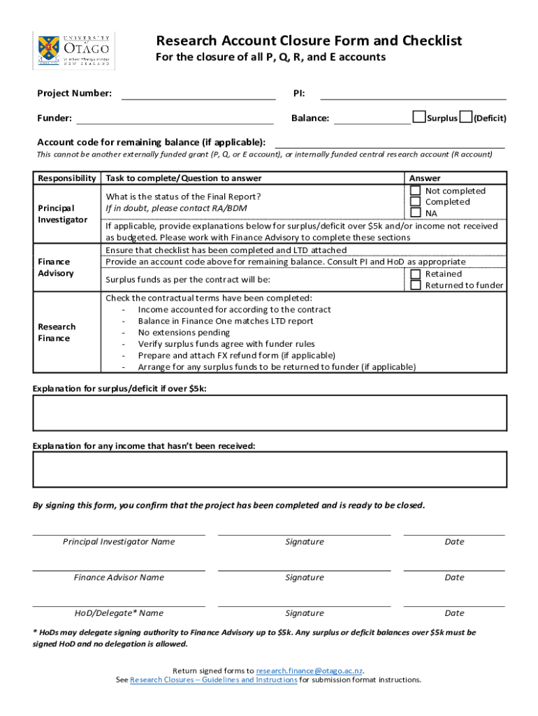 Research Account Closure Form and Checklist For the closure of all P, Q, R, and E accounts Project Number:PI:Funder:Balance:Surplus(Deficit)Account code for remaining balance (if applicable):This